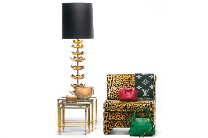 Feldman lotus table lamp circa 1960; brass nesting tables in the style of Maison Bagués circa 1960s; Billy Baldwin style slipper chairs in leopard velvet circa 1970s; prices available upon request, all from Interior Motives (Instagram: @shopinmo)