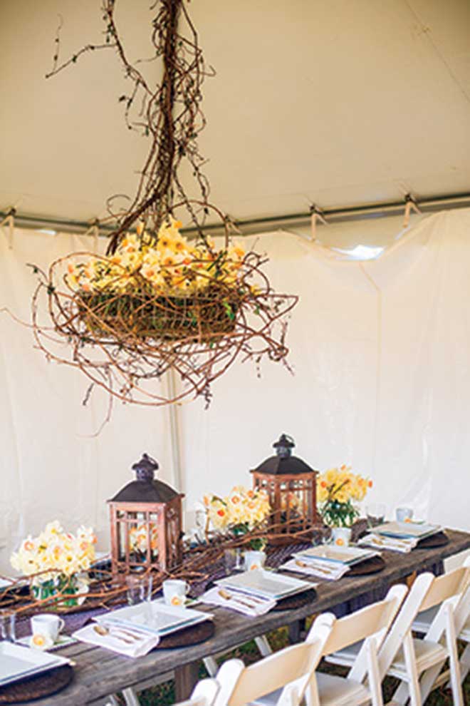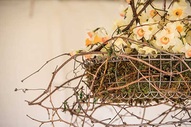 Another great way to bring the outdoors inside is to create a chandelier of daffodils. I use a moss-lined hanging basket and fill it with small jars of cut stems from the field. I then round out the chandelier with grapevine and other natural materials.