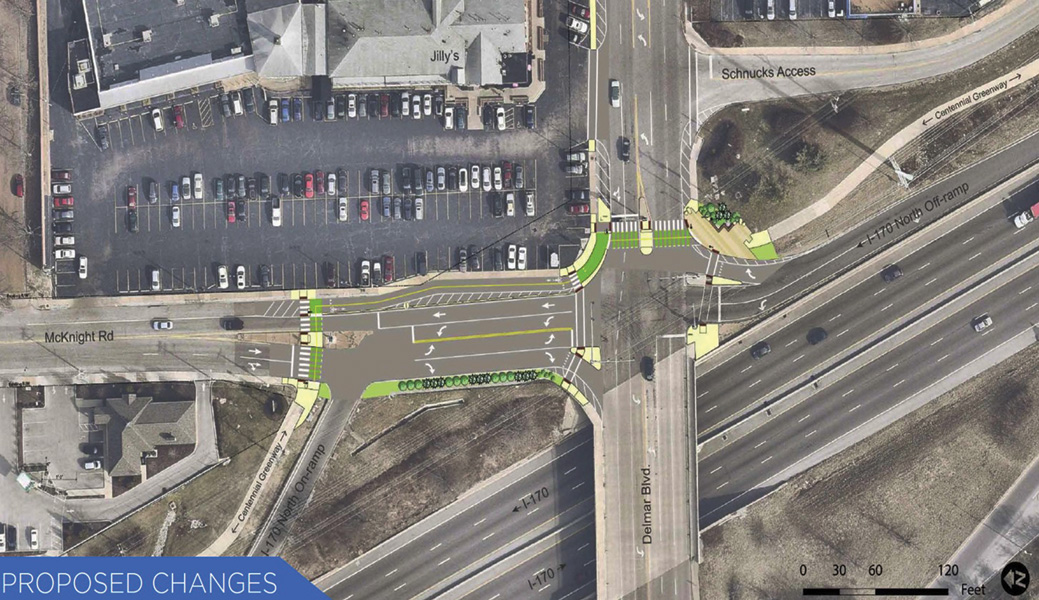 The Centennial Greenway is a beautiful thing, for most of the way. But getting from here to there at Delmar and McKnight has been daunting since the section between Olive Boulevard in U. City and Shaw Park in Clayton was completed. For those of you frustrated by the three (!) crossings you have to make at the intersections, Great Rivers Greenway is going to make significant changes to reduce the hassle and, most importantly, improve safety for anyone walking, running, rollerblading, cycling or using a wheelchair. As it stands today, the northbound I-170 exit ramp at Delmar Boulevard is immediately to one side of the Greenway, and an exit/entrance to Schnucks is almost as close on the other side. Southbound Greenway users must cross the northbound entrance ramp to the interstate. It can be nerve-wracking for drivers, too. Over the summer, Great Rivers heard from nearly 100 metro residents about what could be done to improve the intersection. Among the most requested intersection elements are striped crossings, refuge medians and protected intersections. Without any impact to vehicle traffic, the proposed changes include: