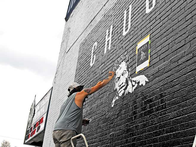 The late Chuck Berry already has been immortalized by historians as the ‘father of rock ’n’ roll,’ and he so frequently performed at Blueberry Hill in U. City that some in the StL may have imagined him to be immortal. But although he passed on March 18 at the age of 90, his music will live on forever. It’s even way out of this world, and probably the solar system … Johnny B. Goode was the only rock song on a recording launched into outer space in 1977 on the Voyager spacecraft in an effort to depict life and culture on Earth in case extraterrestrial beings happen upon it. But on Berry’s home planet, despite his legal problems and checkered past, he is revered, and nowhere more than in the Loop. A bronze of Berry playing guitar—on the north side of Delmar Boulevard near Salt + Smoke—was festooned with flowers and bead necklaces, stuffed animals and candles at its ‘duck walking’ feet. Pedestrians by the dozens paused to take selfies with the statue. Vintage Vinyl had an epitaph on the marquee, but most impressive was the giant painting of Berry’s posthumous album, Chuck, being completed on the west wall. While on a scaffold, Joe Albanese referred to an image of the cover as he rendered white against a black background. A man strolled up to snap a picture with his smartphone right as a reporter took one with his camera and said, “We’re gonna make you famous!” Albanese paused, looked down and shrugged, quipping, “I’m already famous.” The album he was memorializing on the brick wall is the first Berry had recorded since 1979. It will be released in June, and the buzz from critics, notably Rolling Stone, is positive.