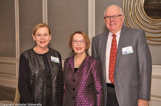 Pictured: Marianne Gleich, Webster University chancellor Elizabeth Stroble, Peter Gleich