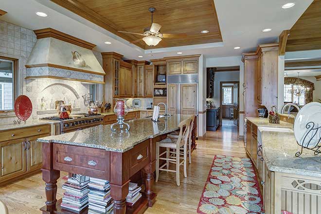 The property features ponds with a running creek, a garden and 180-degree views of the lake, which Suzanne says is perfect for swimming. “Our 11 grandkids are here often, and I feel very comfortable letting them swim in the water,” she says. “The water is filtered from two other lakes, and you can almost see your feet because it’s so clear!” The couple take full advantage of their waterfront property. “We have two kayaks, two pontoon boats, a paddleboard and canoe,” she says. “We go on wine cruises every night and meet up with other boats on the water and then come back here for the gorgeous sunsets.” They both love the absence of noise and activity. Dave adds that the only reason to be inside is if it’s raining. “Being outdoors is what it’s all about,” he says. However, the house offers every amenity, once you do go indoors: an expansive kitchen with professional appliances, media room, extensive gym, and a large, screened-in porch.