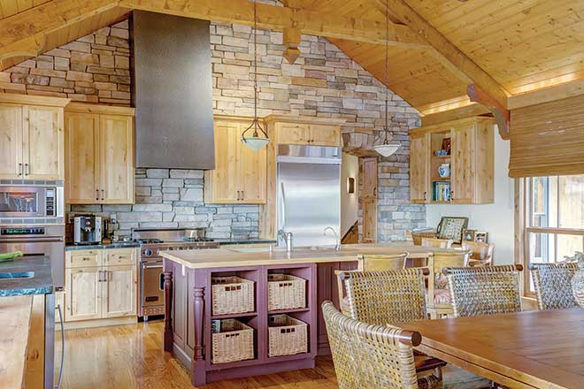 Fiehler says she put her heart and soul into creating a home that reflects who they are as a couple. “We wanted it to resemble a Western ranch that blended influences of the Midwest and the mountains of the West,” she says. The woodwork, stone and vaulted ceilings with wood beams throughout the home’s 3,500 square feet accomplish her vision. “The see-through fireplace, which you can enjoy in the great room and the kitchen, is one of my favorite features,” Fiehler says. “I love serving dinner and eating it next to a fire. It’s very soothing and comforting.”