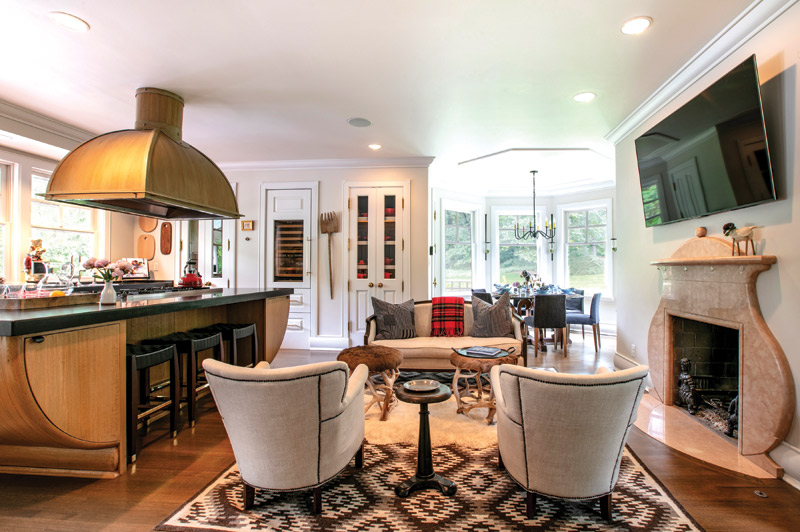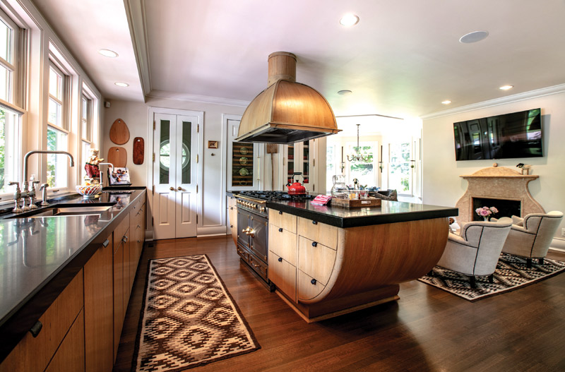 We wanted to stay true to Gund’s vision, so we simply updated what was already there. Wade Richardson, the master craftsman who did all the woodwork for Blackberry Farm, flew in to work on the house. He’s a true artist. One of the spaces he paid the most attention to was the kitchen—he hand-made all the hardware for it. He used Gund’s design for the island, which is shaped like a teacup to match the teapot fireplace, and rebuilt it with modern amenities and finishes. We kept the shape the same, but used modern material for the countertop. We also took out the bookshelves under the island to create space for stools.