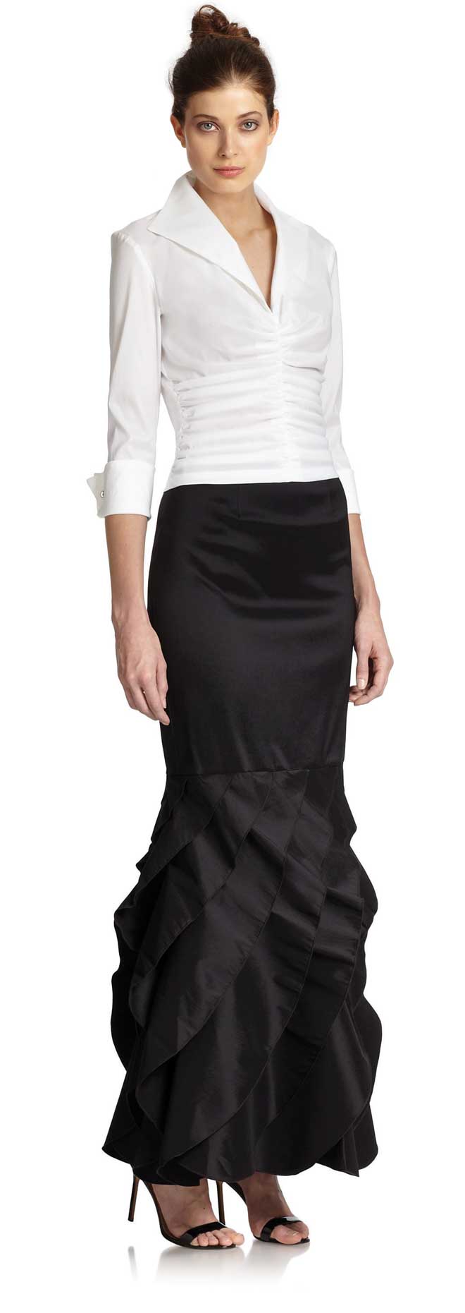 A: I would opt for a maxi or ankle length in cashmere, leather or faux fur. The newest look is wrapped (like a bathrobe), or consider an A-line silhouette like the one pictured here, whichis universally flattering. Don’t skimp on outerwear, as this is a good investment piece you’ll enjoy for many years.